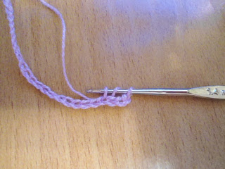 1р. - в 5-ю петлю цепочки провязываем СН. Дальше через одну петлю в следующую в.п. цепочки повязываем 2 СН, разделенных 1 в.п. Вяжем таким образом до конца ряда.