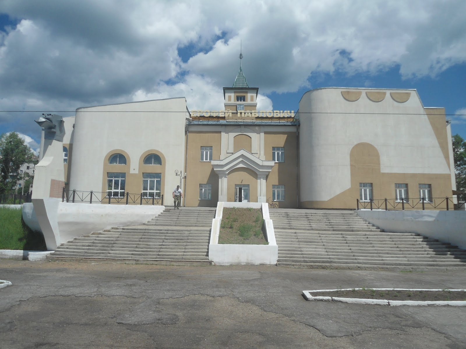 Ерофей Павлович- поселок городского типа в Амурской области. Назван в честь Ерофея Хабарова- путешественника и исследователя. Вокзал оформлен вот такими странными ладьями. Наверно символизируют они, что раньше сюда по реке добирались. Здесь протекает река Урка -приток Амура. Разница с Москвой 6 часов.