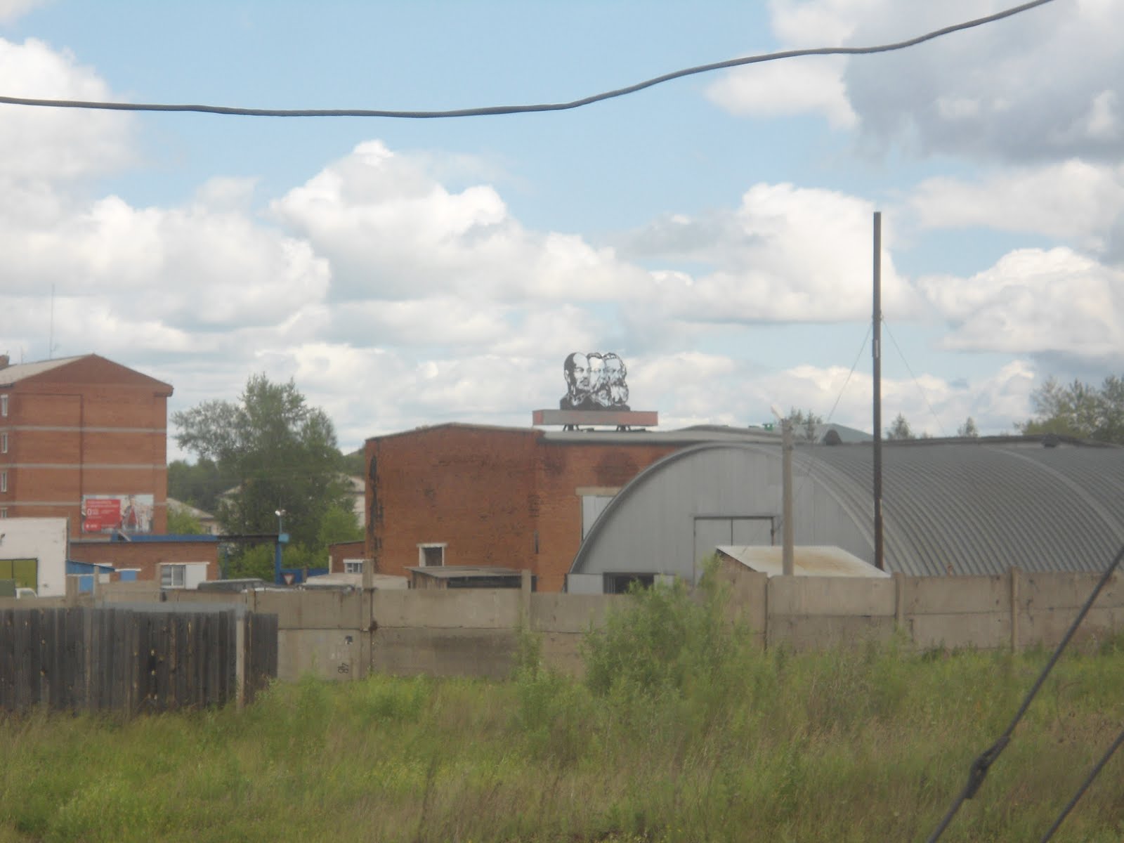 Не помню, что за город. Виднеется интересная конструкция из метала. Ленин, Энгельс и Маркс.