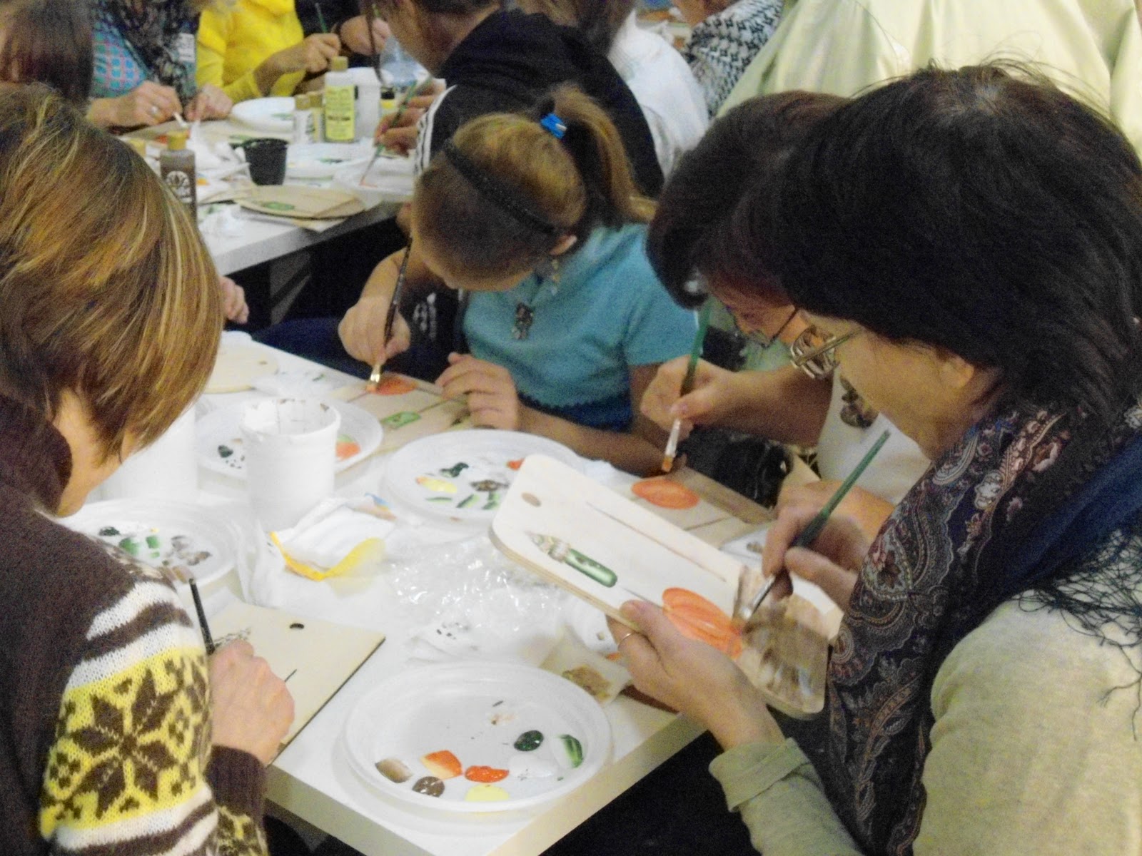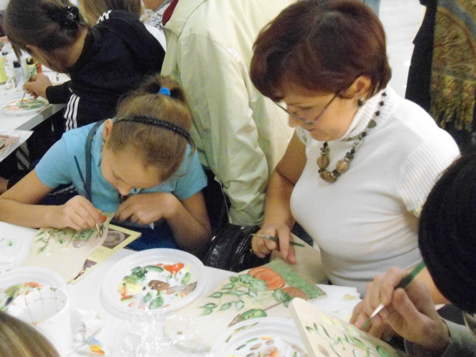 Мы пару недель назад ходили на бесплатный МК "Роспись одним мазком" в Леонардо. Давно хотелось с мастером пообщаться. Посмотреть как профессионалы работают. А то у меня основные учителя-журналы да интернет Удобно,конечно. да с живыми людьми все ж таки приятнее общаться. Так понравилось!!!! Мы с Полинкой старались красоту делать, а вот муж мой стоял над душой и советы давал. Главное тоже себе досочку взял,а сам побоялся видимо, вдруг не получится)))) Ох этот Левка. Всегда он так- умничать любит.Ну хоть нас за делом сфотографировал-хоть какая-то польза от него была.)))