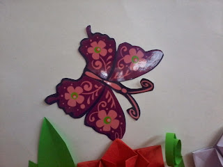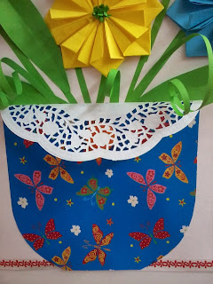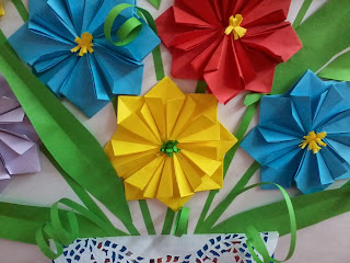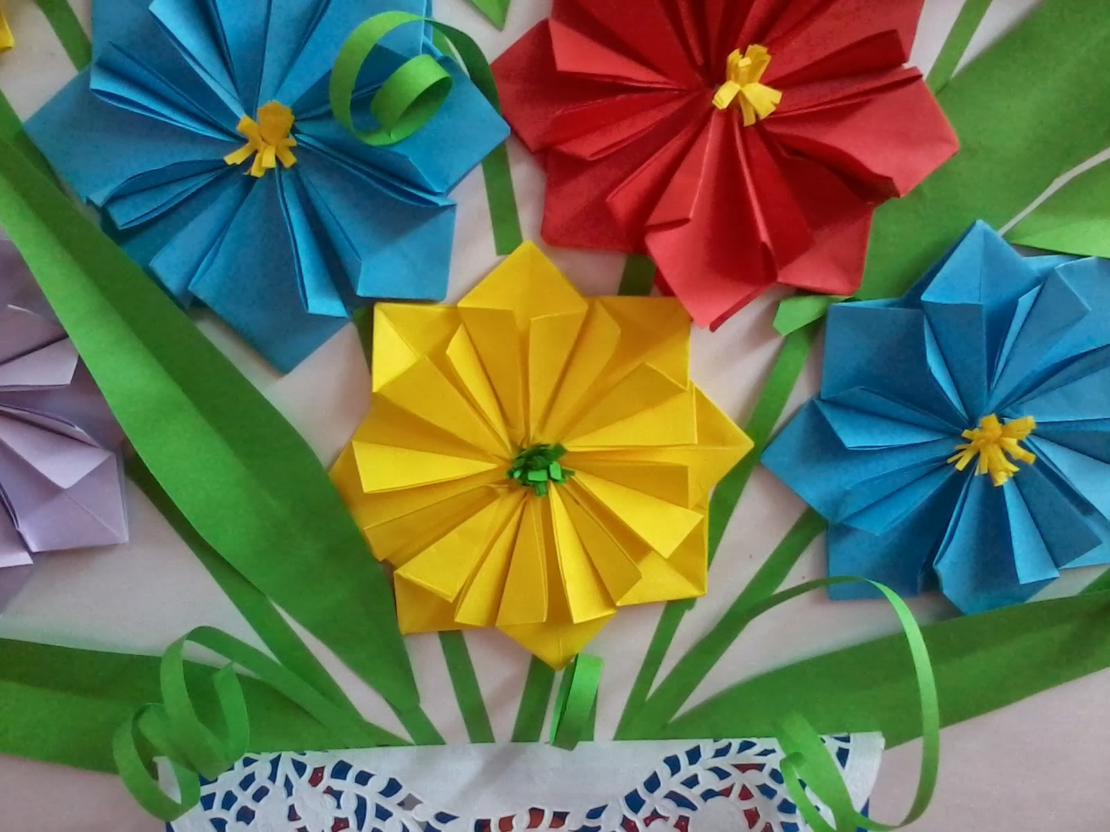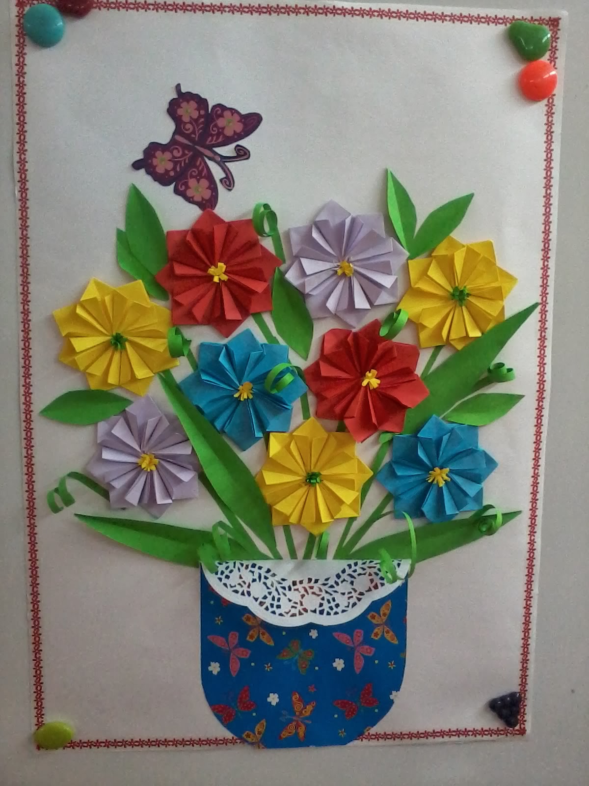 В этот раз мы сделали панно с цветами , выполненными в технике Оригами. Первоначальной моей целью было закрепить навык детей в складывании одной из базовых форм, применяемых в оригами. Эта форма была "двойной квадрат" Она часто применяется для разных работ. И сложно объяснять большому количеству детей, чего же я от них хочу. Вот мы в свободное время и занялись этим. Так дети так увлеклись, что наделали мне этих цветов целую кучу . Мы и открытки для мам сделали и вот такое красивое яркое панно.