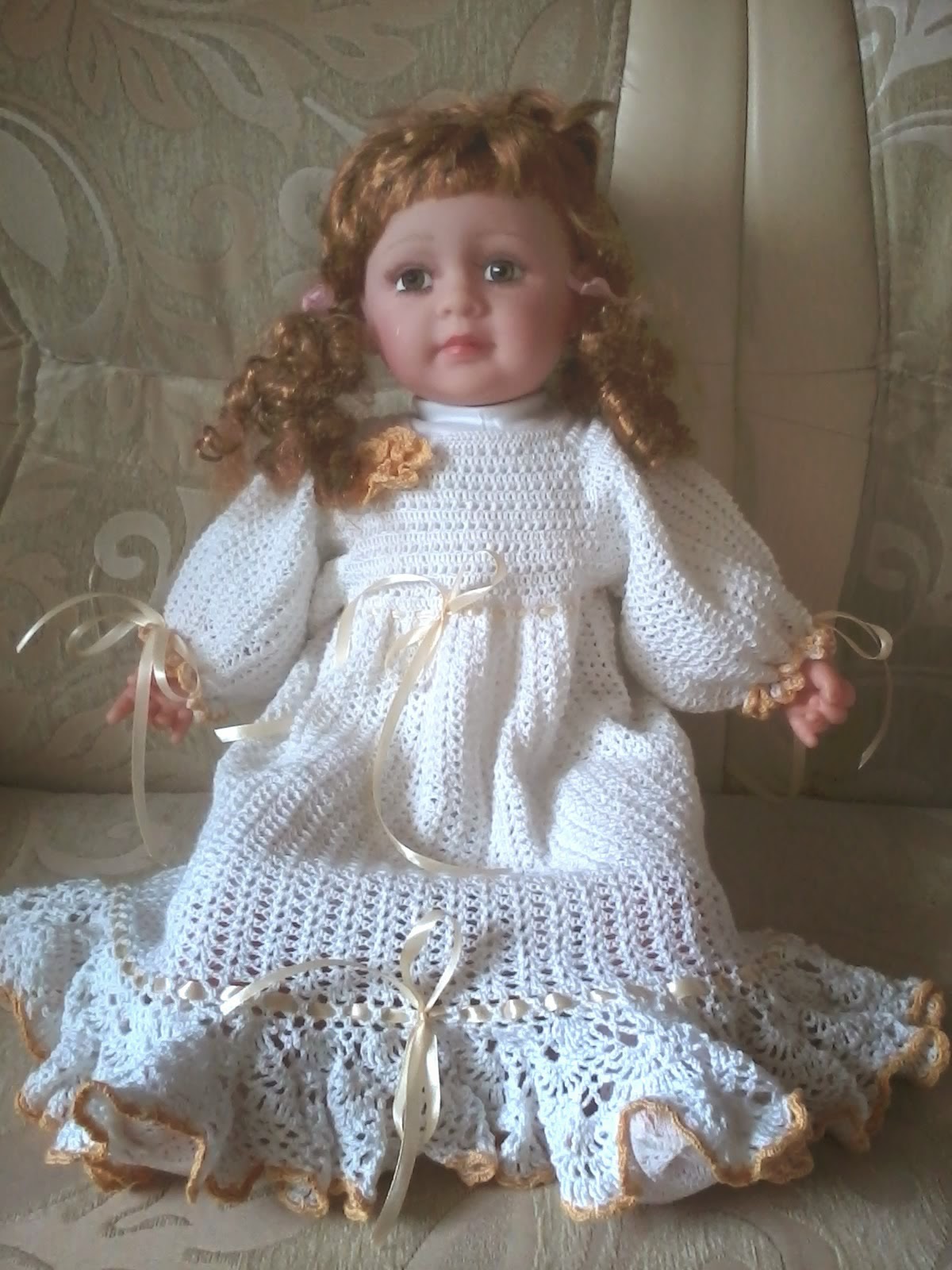 Недавно мне заказали комплект для девочки на кристины. Сразу признаюсь, что такой объем я ни разу крючком не вязала. Но заказ очень заинтриговал и я согласилась. Нитки взяла микрофибру. Они очень приятные и в работе и на теле. Как всегда вязала "на глаз". Но результат лично мне понравился. Я на девочке не видела. Но у меня есть большая кукла и платье я примерила на нее.Торопилась отдать. Поэтому фото сделаны на телефон. Очень жаль, что не передать той нежности, которую можно показать с помощью хорошего фотоаппарата.