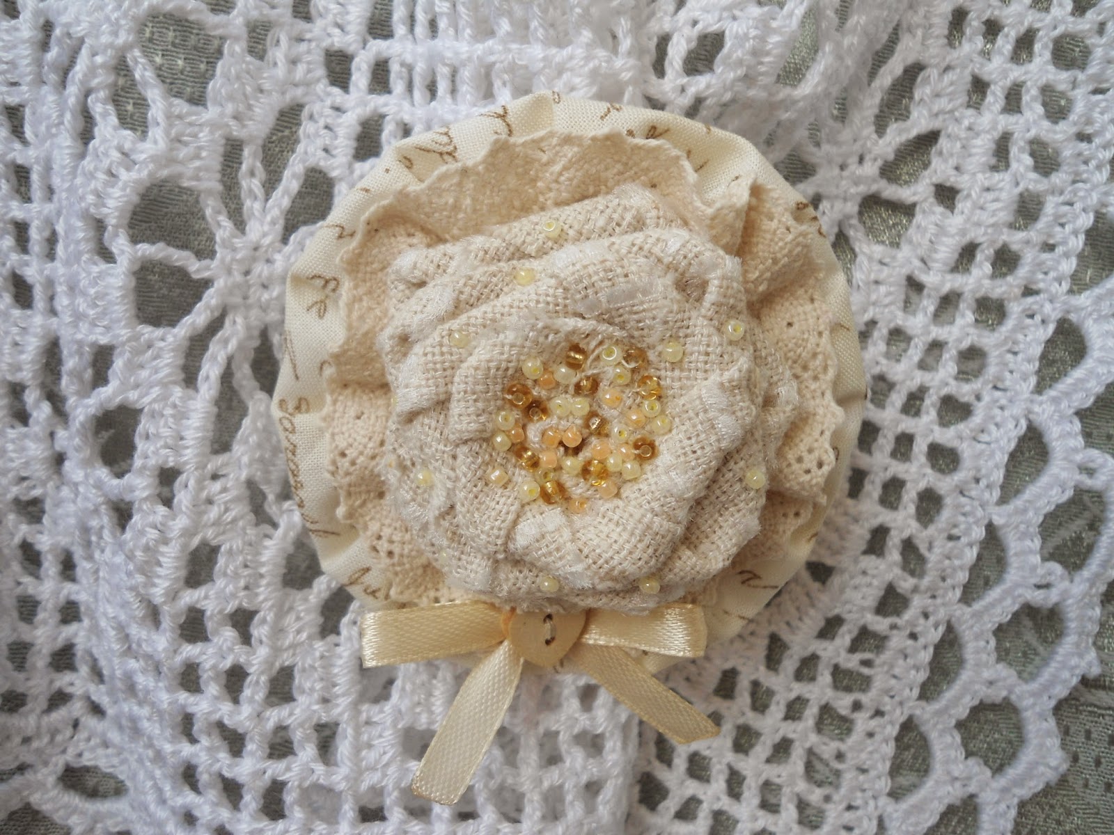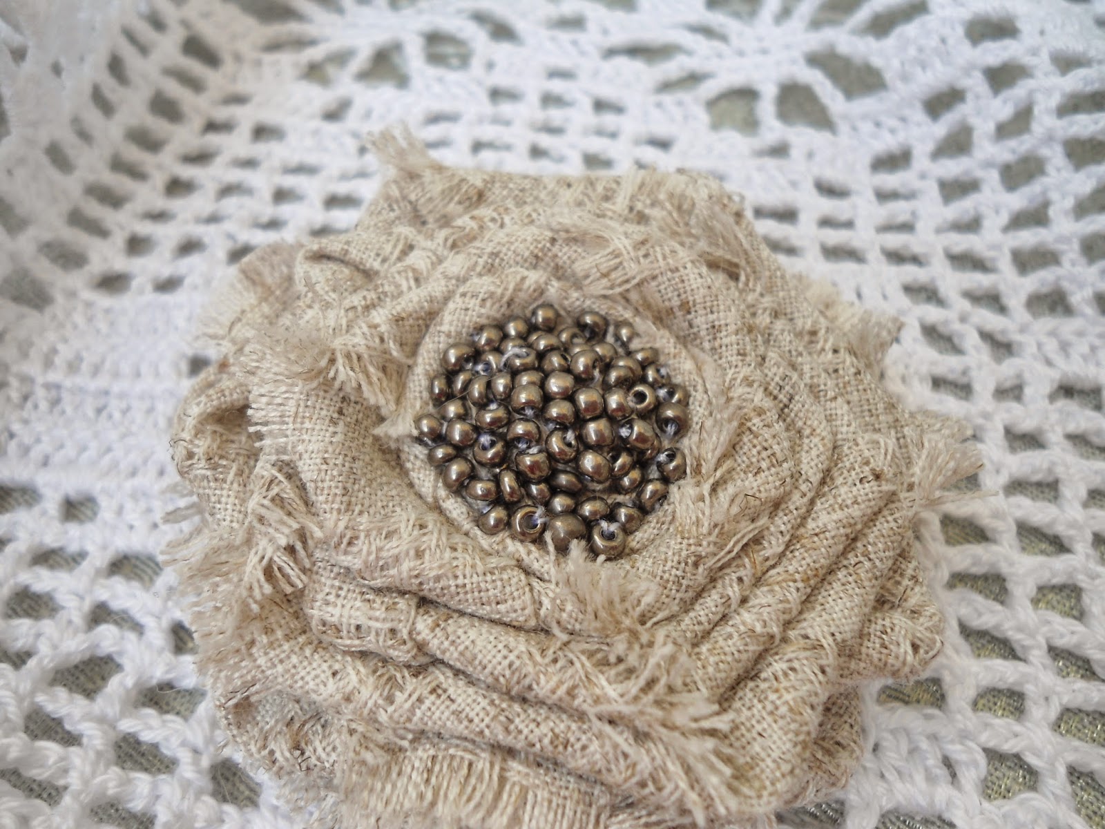 В этой броши использован лен двух цветов и кружево соответствующих оттенков. Все просто. Серединка цветка также ,как и у предыдущих "усыпана"бисером. |